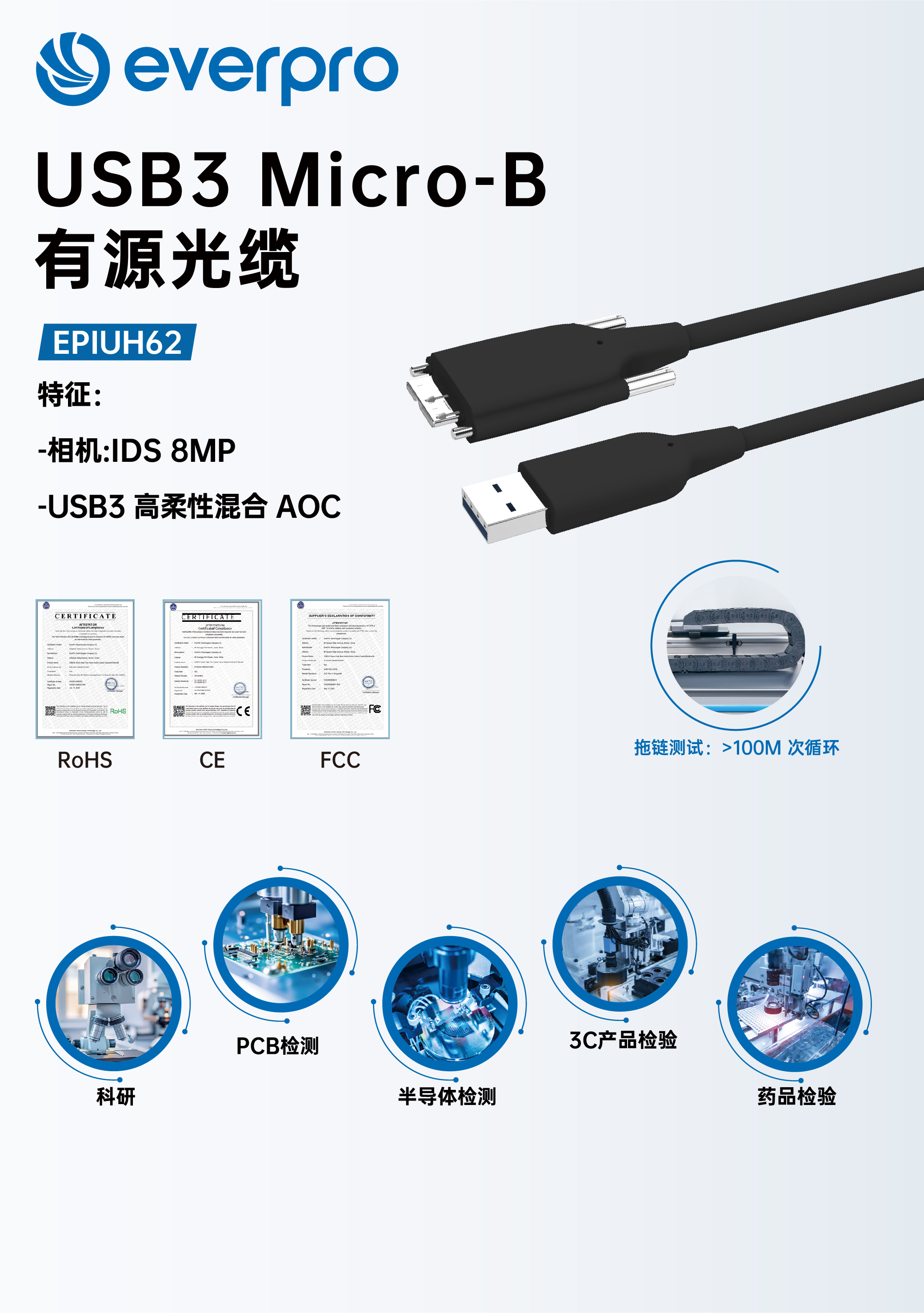 USB-MicroB高柔AOC,專為機器視覺設計,通過了超1億次的拖鏈測試,廣泛應用于科研、PCB檢測、半導體檢測等行業領域。