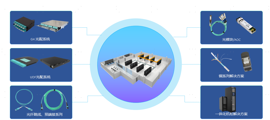 此次數據中心局部布局采用TOR模式,為低延時、大帶寬的需求帶來可靠的基礎,整個項目采用iCONEC?G4光纖配線架用于滿足1U96芯的業務需求,對于高密度區域采用1U144芯UDF光纖配線架,采用24芯OM4及單模MTP預端接光纜分別作為短距離和長距傳輸主干線纜,水平線纜同時布放了CAT.6A UTP用于EDA區域上行傳輸, 充分兼顧了數據中心的性價比及未來發展趨勢。